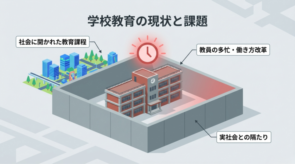 国は「社会に開かれた教育課程」を掲げ、子どもたちが実社会とのつながりを通じて学ぶことを求めています。しかし、学校現場では教員の多忙化などにより、外部社会との連携が難しい「実社会との隔たり」という課題を抱えています。