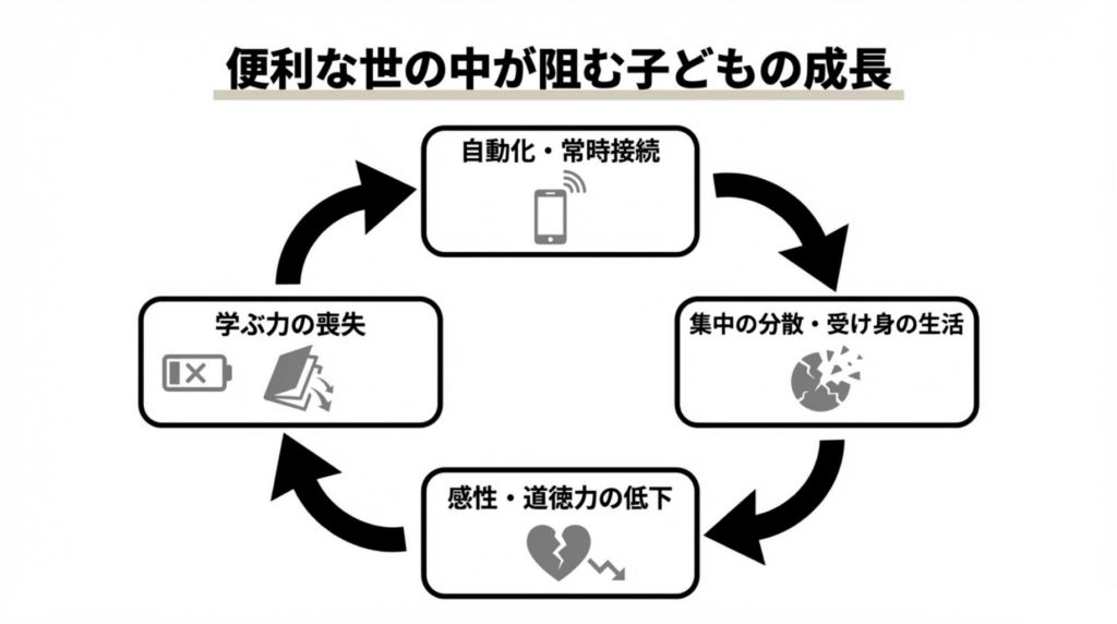 現代の子どもたちは、スマートフォンをはじめとする便利な道具や、自動化・常時接続された環境に囲まれています。この利便性は、自ら行動する必要性を減らし、困難な事象に直面する機会を奪っています。