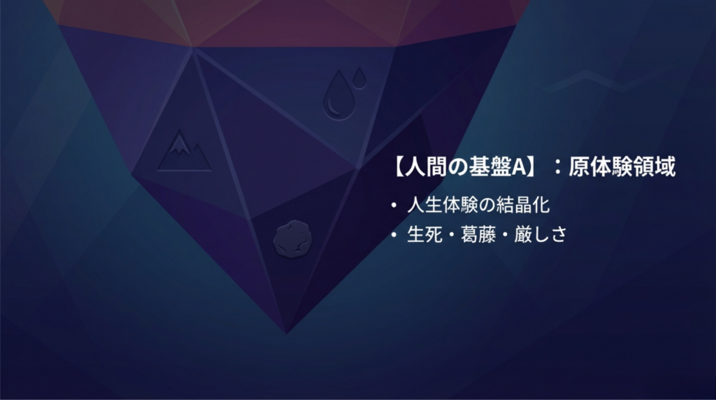 葛藤や厳しさを乗り越えた経験、あるいは生死に触れるような強烈な人生体験が、氷山を支える強固な土台(結晶)となります。