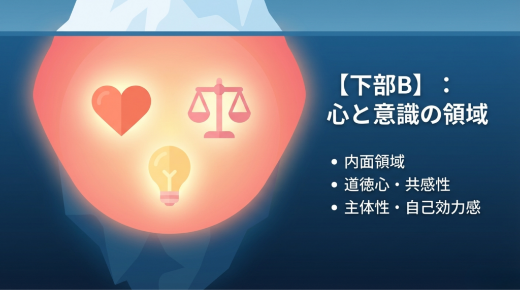 目に見える「思考や行動」は、水面下の深い「心や経験」によって支えられています。