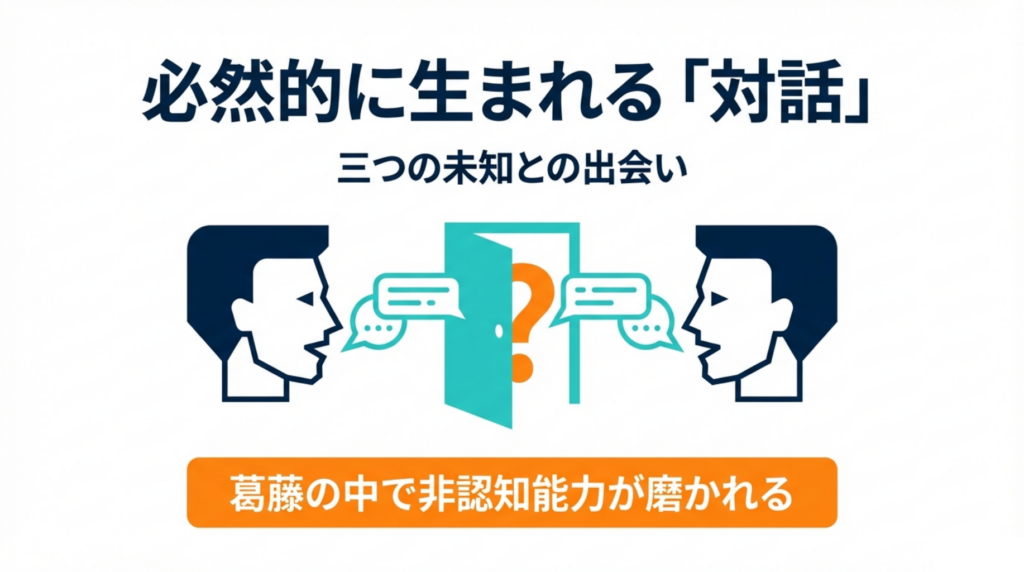 未知の扉の前で生まれる葛藤は、自分自身と向き合う「自己対話」や、仲間と知恵を絞る「他者との対話」を必然的に引き出します。