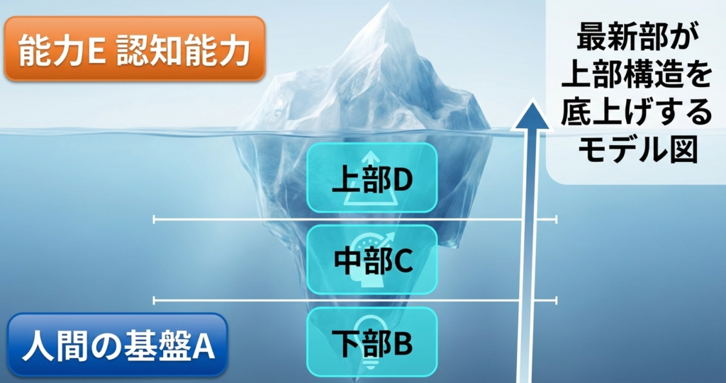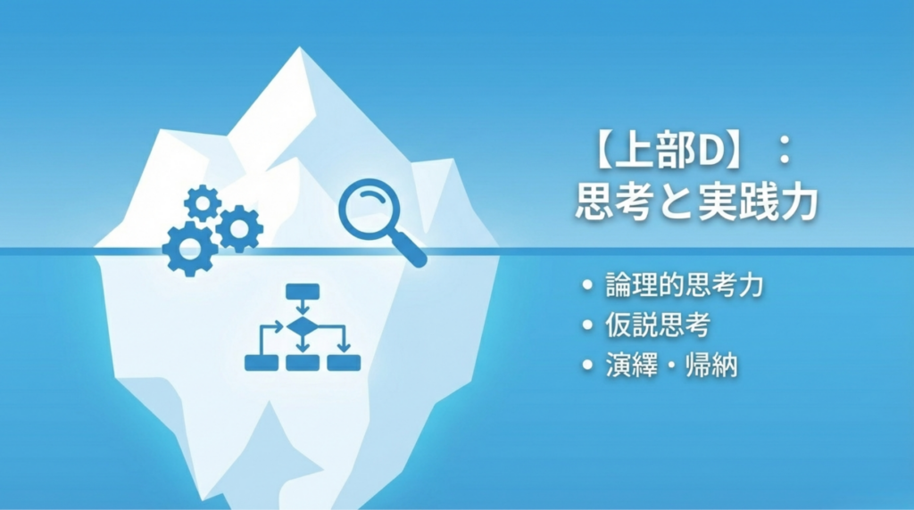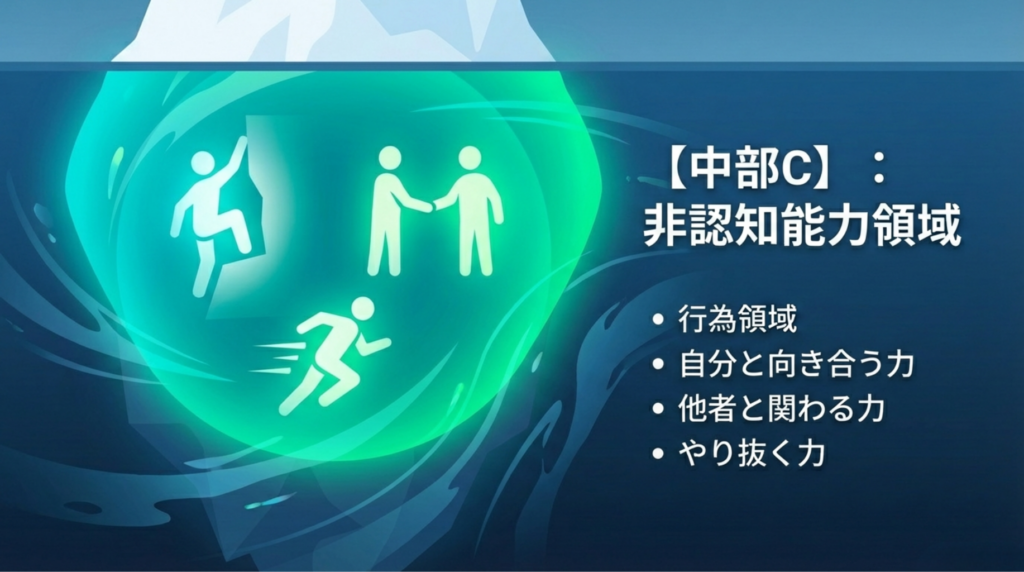 私たちはこの複雑な能力を、ジェームズ・J・ヘックマンの研究やOECDの定義に基づき、4つの層からなる「氷山モデル」として体系化しました。