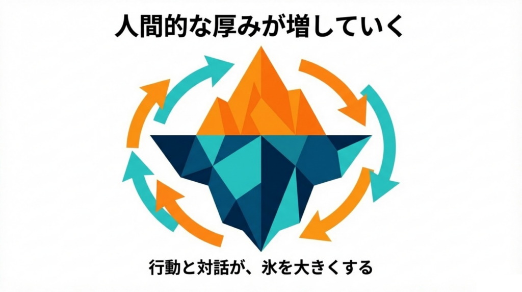 未知への挑戦と対話を繰り返すことで、水面下の非認知能力が氷のように大きく結晶化し、「人間的な厚み」が増していきます。