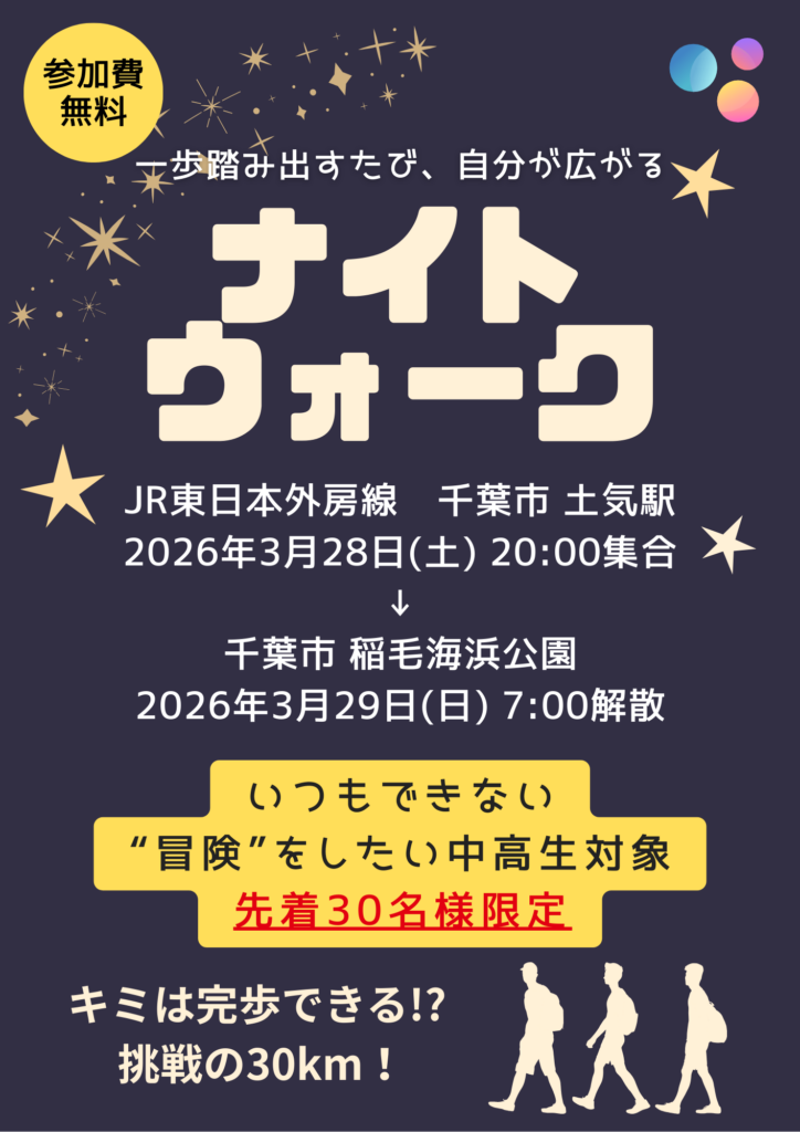 ナイトウォークは、約30kmを、仲間と共に夜通し歩き切る「挑戦型プログラム」です。
