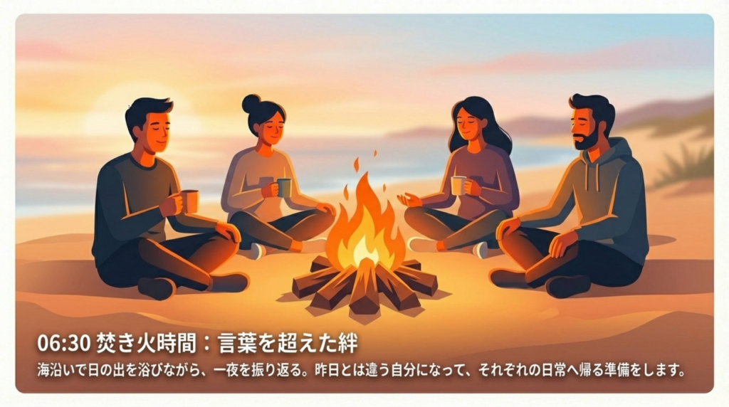 旅のクライマックス。海沿いで日の出を浴びながら、焚き火を囲んで一夜を振り返る。言葉を超えた絆が生まれます。