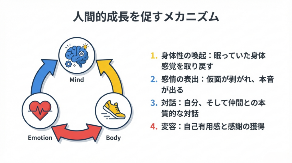 一歩の積み重ねでゴールした経験は、「自分には力がある」という自己有用感を育み、当たり前の日常や支えてくれる人々への深い感謝へと繋がります。