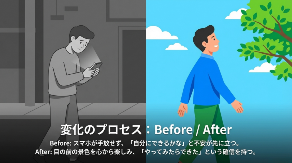 意識の向き先 スマホが手放せず、画面の中の他人の反応ばかりが気になる。 スマホがなくても、目の前の仲間との会話や景色を心から楽しめる。