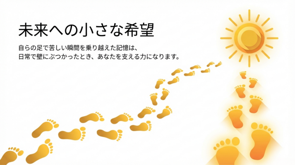 【確信】 自らの限界に挑み、自分の足で一歩ずつ進んだ記憶は、日常で壁にぶつかったときにあなたを支える「未来への小さな希望」へと変わります。