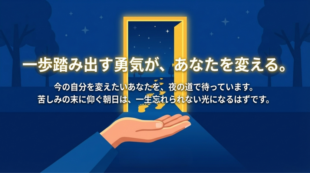 一歩、また一歩と足を前へ進めるその確かな手応えが、あなたの未来を切り拓く力へと変わる。一夜限りの、しかし一生消えない特別な体験がここから始まります。