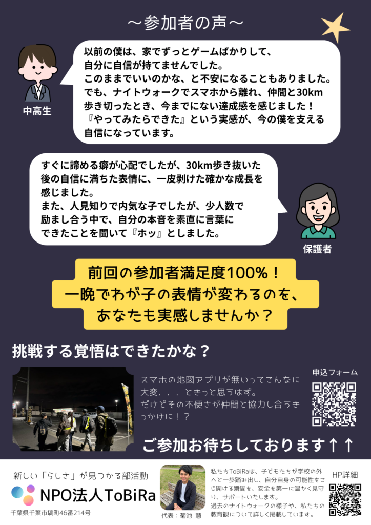 今の自分を変えたい。仲間と本気でぶつかり合いたい。デジタルのない静かな時間を過ごしたい。 そんな思いを抱えているあなたを、私たちは夜の道で待っています。 苦しみの末に、仲間と共に仰ぐ朝日は、きっと一生忘れられない光になるはずです。