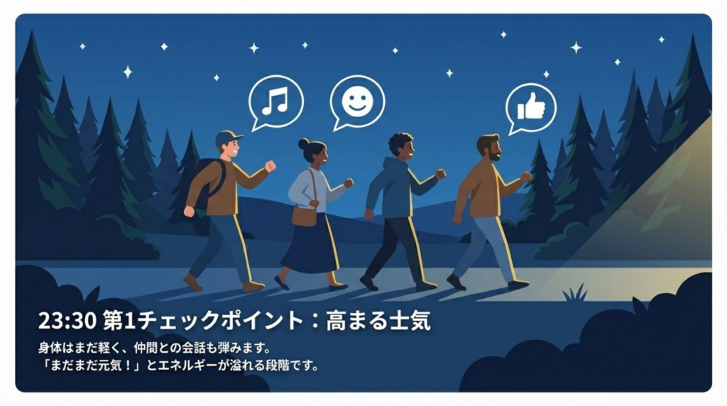 最初の休憩。身体はまだ軽く、仲間との会話も弾みます。「まだまだ元気!」と士気が高まる段階です。