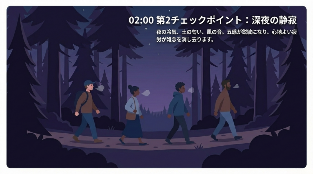 夜の冷気、土の匂い、風の音。五感が鋭敏になると同時に、心地よい疲労が雑念を消し去ります。