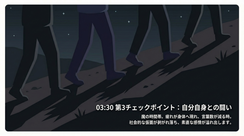 魔の時間帯。少しずつ「疲れ」が明確に身体へ現れ始めます。言葉数が減り、自分自身との闘いが始まります。