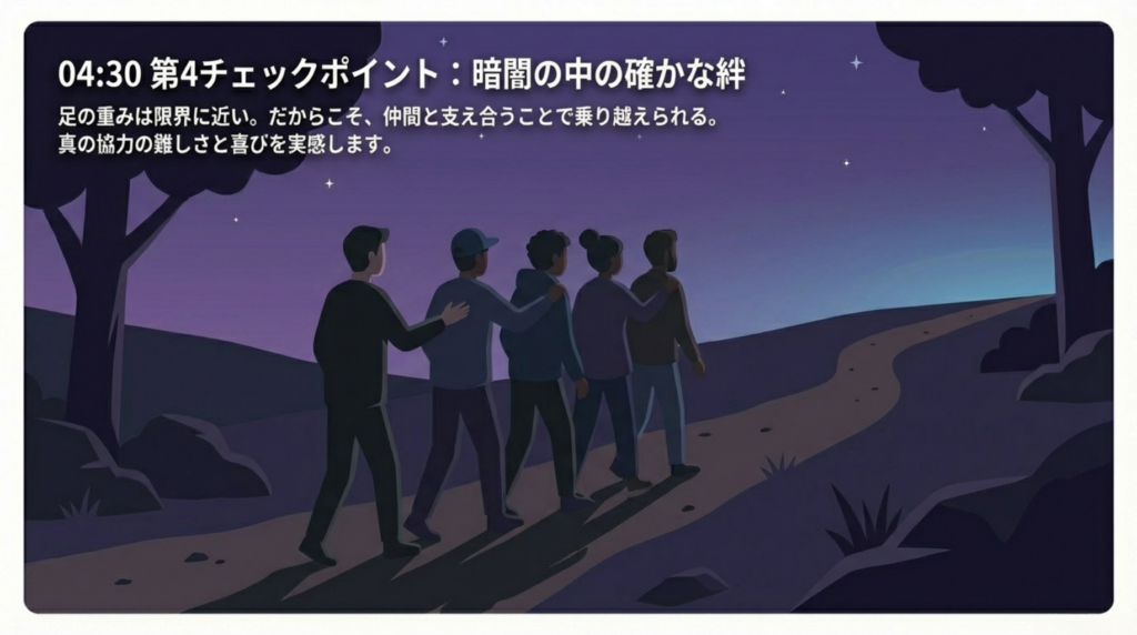 一人では挫けそうな道のりも、仲間と支え合うことで乗り越えられる。真の協力の難しさと、それゆえの喜びを実感します。